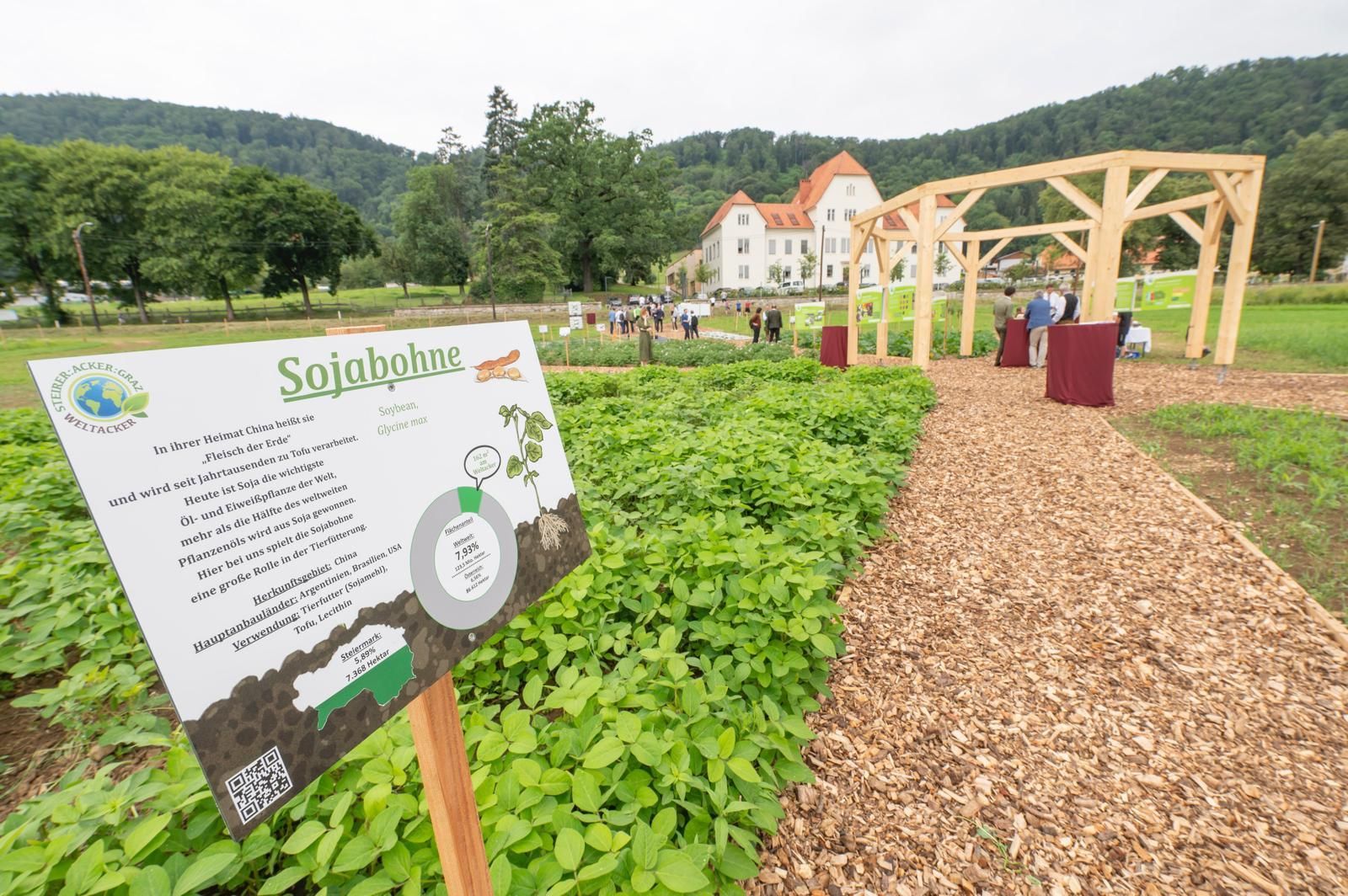 für die Tierhaltung werden auf der Fläche angebaut. Faserpflanzen zur Herstellung von Kleidung, aber auch Pflanzen zur Erzeugung von Genussmitteln finden ihren Platz.Der weltweite Anbau wird auf dem Weltacker maßstabsgetreu abgebildet, so werden z.B. 197 Mio Hektar (ha) Mais hier durch 259 m2 dargestellt.
